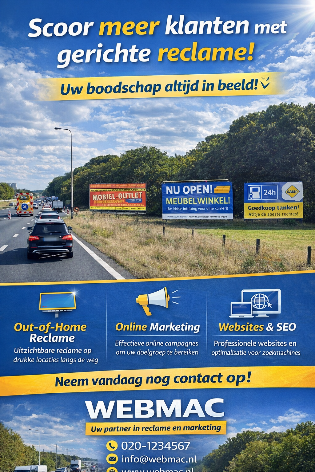 Wilt u adverteren midden in uw doelgroep via Out-of-Home (OOH) reclame, maar weet u niet waar te beginnen of heeft u geen tijd? Webmac helpt u met het ontwikkelen en plaatsen van professionele fysieke advertenties op strategische locaties. Wij zorgen voor sterke ontwerpen, duidelijke boodschappen en maximale zichtbaarheid voor uw merk.